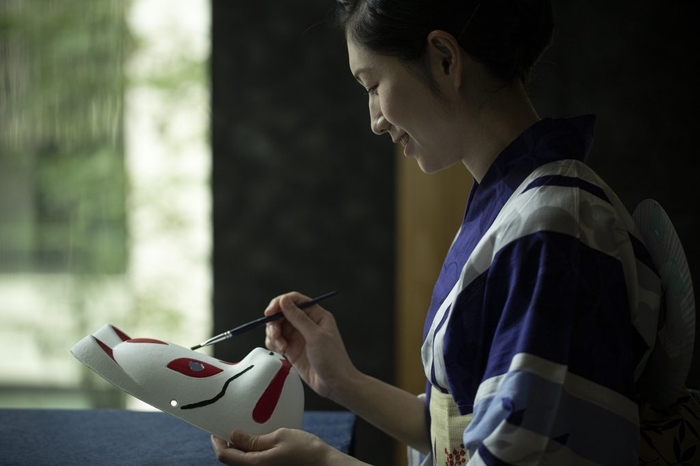 「星のや縁日」は、夏祭りの雰囲気と江戸の文化の両方を気軽に体験できる催しです。夕方になると、静かで落ち着いた雰囲気のロビーが、夏祭りのお囃子を思わせる賑やかなBGMを合図に、活気づきます。屋台が立ち並ぶ空間で、夏の風物詩である江戸風鈴の絵付けや張り子のお面づくりを体験できます。また、星のや東京のロビーの一角では、江戸時代に創業した豊島屋酒造の地酒と合わせて、日本橋にある老舗練り物店神(かん)茂(も)の一枚一枚丁寧に手作業で型どりをした「手取り半ぺん」に生姜醤油をかけて提供します。