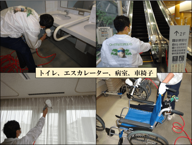 今回、抗菌バリアコーティングの施工を完了した十三市民病院は、4月27日より一般外来を休止し、新型コロナウイルス感染症患者の入院受入を行う重点医療機関として、中等症の入院患者の対応にのみ専念してこられました。この度、外来受け入れの目処がたったため、当社施工チームによる抗菌バリアコーティング剤の吹き付けを7月13日から15日の3日間にわたって院内各所に施工。再開への準備を進めています。