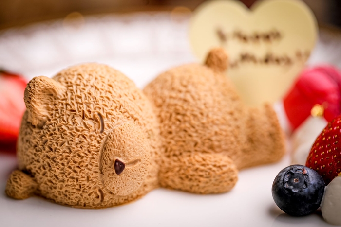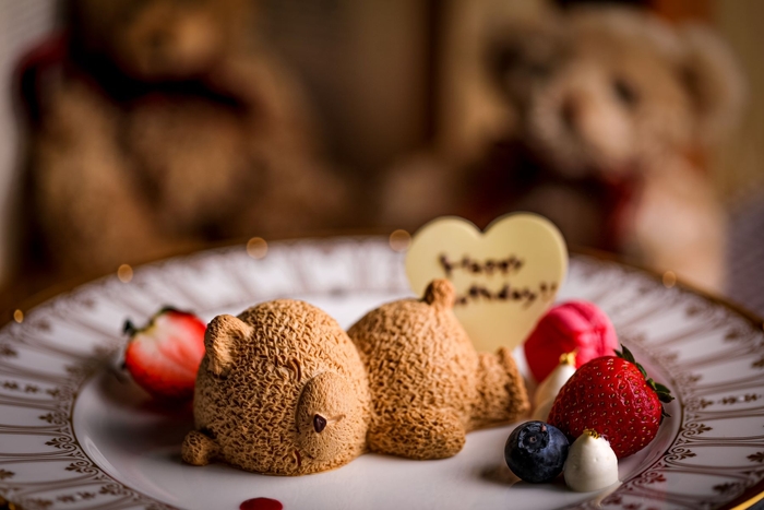 オプションの『スリーピングベアケーキ』は、“横になって寝ている、ゆるかわいいクマ”を表現。表面のショコラムースの中は“クレームバニーユ”と“クーリーフランボワーズ”で構成されており、2種類の味が楽しめるパティシエこだわりの一皿に。