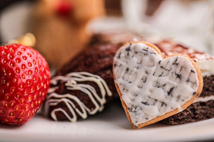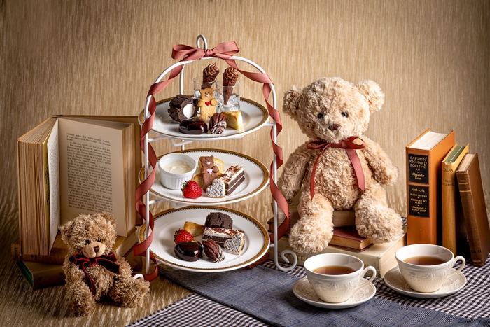 かわいいハートのチョコレートムース/ミニチョココーン/チョコレートのロールケーキ/ジェノワーズショコラケーキ/国産フレッシュいちご/グレンチェックのハートクッキー/ハートをかかえたテディベアクッキー/ショコラマドレーヌ/イングリッシュスコーン/自家製クロテッドクリーム