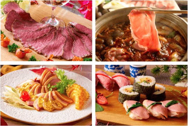 ◼️ 下段右:ご飯ものも肉!ローストビーフ握り、鴨ロース握り、そして甘辛いプルコギを巻いた太巻きの「肉寿司3種盛」。