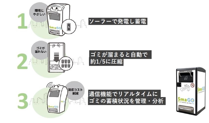 「SmaGO」1セット(〔ペットボトル・かん・びん用〕、〔その他用〕の2台で1セット)を設置します。ポイ捨ての抑制や街の美化に対する意識の変化、ゴミ分別の意識醸成などを検証するために取り組むものです。