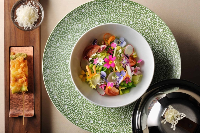 当ホテルのガーデンエリア「みやぐりん」に蝶が舞い降りた様子をイメージしたサラダ。クロッシュ*5にお好み焼きに使うフタを使い、取っ手に蝶のチュイルを添えます。野菜の下にシーザードレッシングを敷き、アスパラガスとベーコンの串を一緒に混ぜるとシーザーサラダに変化する一皿です。