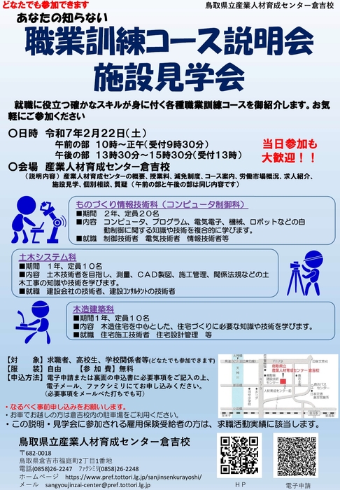倉吉校では、次の日程で職業訓練コースの説明会・施設見学会を昨年12月より実施しています。令和6年度最後の職業訓練コースの説明会・施設見学会を2月22日に実施します。