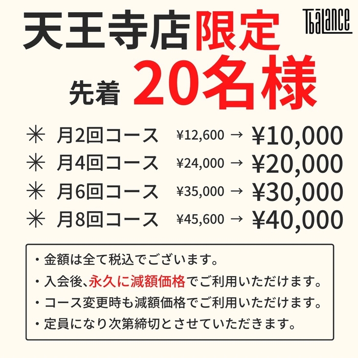 天王寺店20名様限定!9月入会で、月会費が最大¥5,600も『永久に』お得になるキャンペーンを実施中!