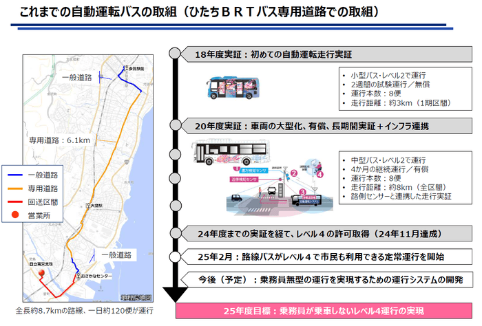 2022年度からは、特定の条件下で人が運転に関わらない専用道路内での「レベル4」運転を見据えた実証実験が行われ、2025年2月3日から自動運転レベル4の営業運行を開始しました。