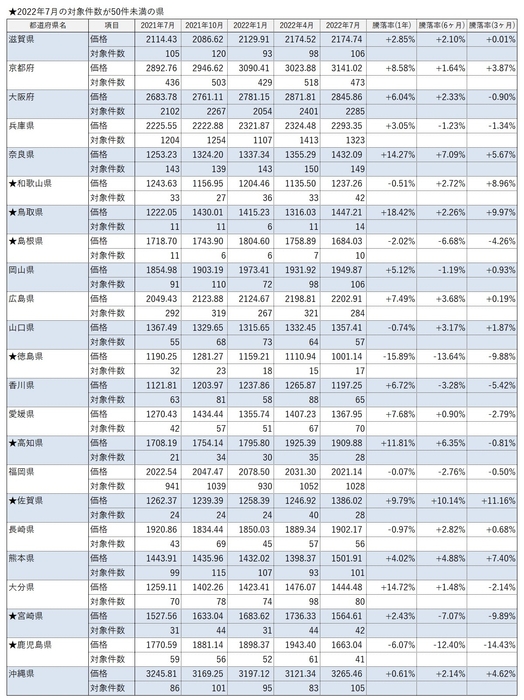 ※2022年7月の対象件数が50件未満の16県については、算出根拠となるデータ数が少ないため★をつけて掲載。