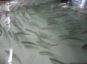 近畿大学水産研究所富山実験場(富山県射水市)では、サクラマスの「準絶滅危惧種」指定や漁獲量の激減をうけ、平成23年(2011年)からサクラマスの養殖研究を開始し、平成28年(2016年)10月に完全養殖を達成しました。平成28年(2016年)11月からは、富山県入善町および入善漁協と連携し、富山湾深層水(日本海固有水)を利用した完全養殖サクラマスの商用養殖試験に取り組んでいます。清浄、富栄養、低温安定な深層から汲み上げた富山湾の海水を用いて養殖することで、天然魚に比べ、年間を通して脂ののりが良いことが特徴です。