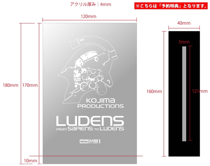 「遊びを届ける」という思いを胸に、ゲームクリエイター小島秀夫氏が立ち上げた『コジマプロダクション』。そのシンボルキャラクターが『ルーデンス』である。その同プロダクションの顔となるキャラクタースタチューを、プライム1スタジオが1/2Scaleで制作しコジマプロダクションオフィスロビーや様々なイベントで展示されている。本アイテムはその1/2Scaleのルーデンスを1/4Scaleに落とし込み、より広いファンへ手に渡る物とすべく商品化。もちろんコジマプロダクション完全監修のアイテムとなっています。頭部のヘルメットと本体には1/2Scale同様にLEDライトアップ機能を内蔵。手にしたフラッグにはワイヤーが埋め込まれ、自由に表情づけが出来る仕様。