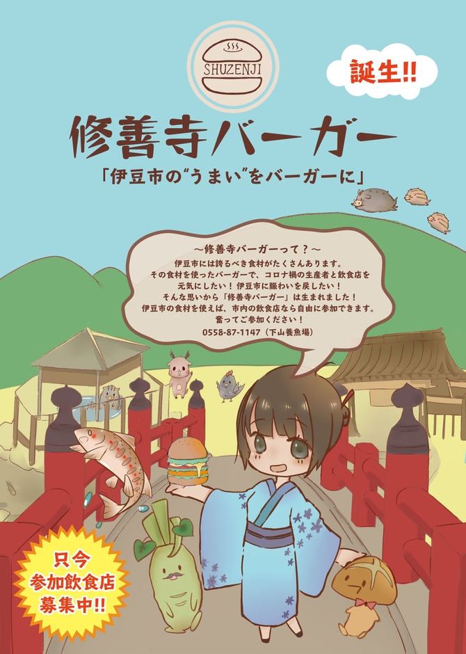 国内でも有数の観光地である伊豆市だが、コロナ禍の影響で、特にGo To トラベル中止後の観光関係の落ち込みは、凄まじく街も活気がない。その影響で伊豆市産の食材も行き先を失い、飲食店も元気がない。そこで「箱根」や「軽井沢」の様にネームバリューのある「修善寺」をキーワードに、伊豆市の食材を使ったご当地バーガーを販売し、生産者と飲食店の活性化を図る。広く参加飲食店を募集し、地域ぐるみでバーガーを発信することで、コロナ後を見据えた伊豆市への誘客を図ることを目的とする。