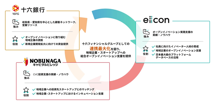 地域に「新規事業創出」「オープンイノベーション」を実装させるために、岐阜県・愛知県を中心に地域企業へ密着した支援を行ってきた「十六フィナンシャルグループ」と累計登録32,000社『AUBA』を中心に、これまで1,700件を超える共創を支援してきた新規事業開発のプロフェッショナル 「eiicon」が協力タッグ。各社の強みを活かして、オープンイノベーションを活用し新規事業創出まで導くオープンイノベーション支援を通して、地域企業・産業の活性化を目指します。