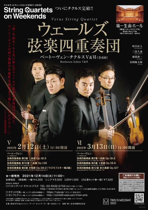 『ウェールズ弦楽四重奏団~ベートーヴェン・チクルスV』が2022年2月12日(土)、