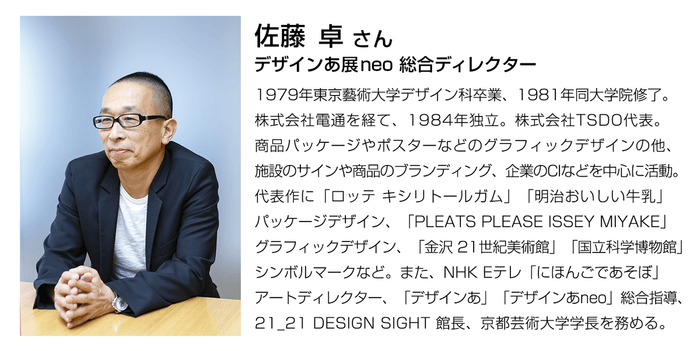「デザインあneo」の総合指導、そして「デザインあ展neo」総合ディレクターを務めているのは、数々のヒット商品や文化的プロジェクトを手がけてきたグラフィックデザイナー・佐藤卓さんです。