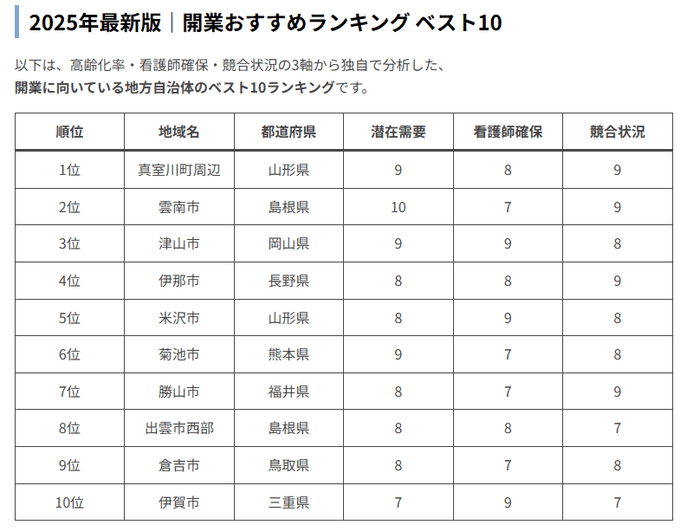 2025年6月、医療・介護事業者向けの経営支援を行う4X株式会社(東京都渋谷区 ※以下4X)は、独自に収集・分析した全国の市区町村別データをもとに、訪問看護ステーションの開業に適した地方自治体ランキング「2025年最新版|開業おすすめランキング ベスト10」を発表しました。