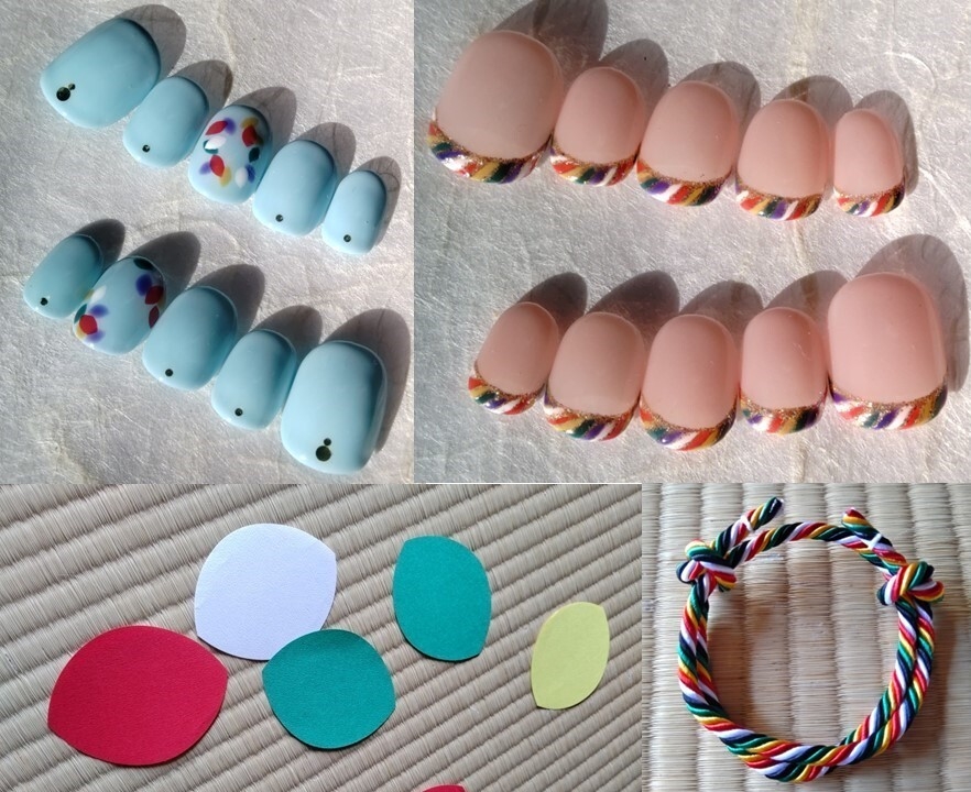 同サロンのネイリストである藤田氏は、神職の資格も取得しています。神社仏閣にて表現される、心清くなるような意匠や縁起物は、まさに日本人の祈りから生まれた最上の美と考え、ネイルのデザインに取り入れました。例えば、法要の際に撒かれる散華(さんげ)や、ご縁の証として神社でもお寺でも大事にされている五色など、神社仏閣由来の美をモチーフにしています。