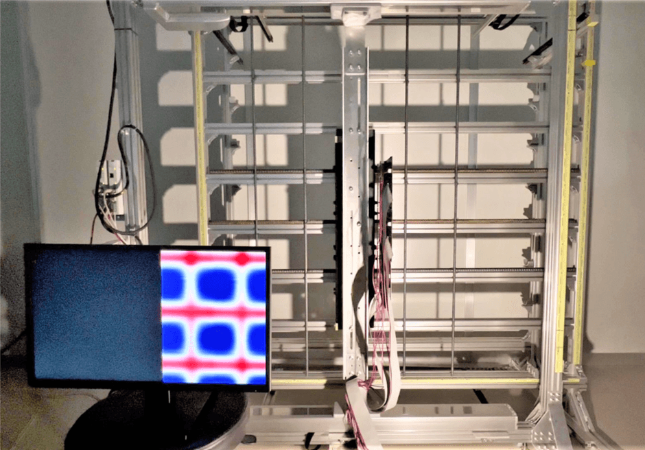 多対センサーモジュールをロボシリンダーに搭載した2次元スキャナーのプロトタイプを用いて、コンクリート中の配筋状態を2次元画像として取得できるか検証しました。永久磁石法にとって、コンクリートは空気と同じであるため、鉄筋がコンクリートに埋設されているか否かは計測結果に影響しません。そこで、検証では、コンクリートに埋設されていないシンプルな格子状の鉄筋サンプルを室内の実験室に準備し、その手前でセンサーモジュールを搭載したロボシリンダーで自動スキャンしました(図3)。