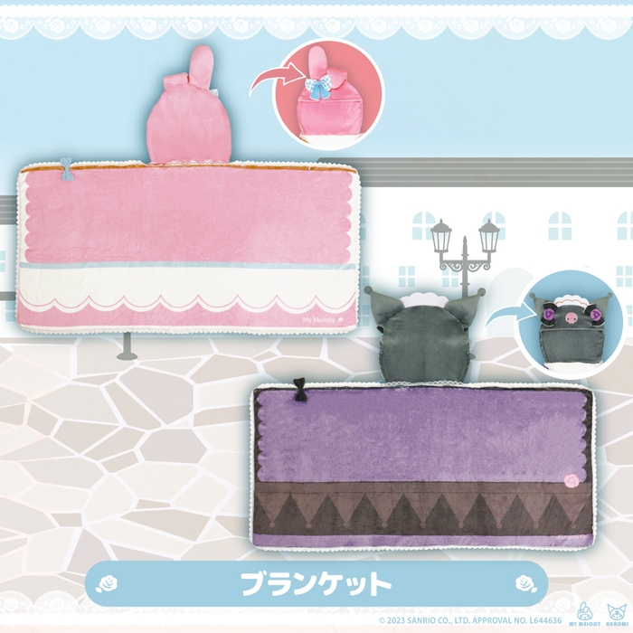 マイメロディ、クロミのそれぞれの衣装をイメージしており、フード部分には耳と頭飾りがついています。あったかくてかわいいステキなアイテムです。サイズ:約64×134cm