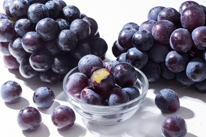 ピオーネは巨峰より粒が大きくしっかりとした食感が特徴で、爽やかな香りに甘みと酸味のバランスが抜群の、黒い真珠とも呼ばれているぶどうです。ジューシーで濃厚なのに爽やかな味わい。バランスが絶妙で飽きない美味しさが味わえます。亀屋万年堂の「ぶどう大福」は、国産の種なしピオーネを使用しており、皮ごと食べられるため、旬の美味しさと栄養をそのまま味わうことができます。栽培に癖があり、非常に手間のかかる品種と言われるピオーネ。農家の方が一つ一つ大切に、手間を惜しまず丁寧に育て上げられており、その気持ちを引き継ぐように、ピオーネの美味しさそのままのフルーツ大福に仕上げました。