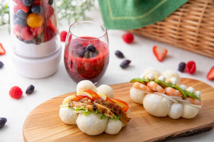パワーウォーキング終了後に、トマム山の山頂から周辺の山々を一望できる絶景ポイントで朝食を用意します。運動後の体力が回復するよう、エネルギー源となる糖質や、筋肉を修復するたんぱく質、ビタミン、ミネラルなどを補う朝食です。メインは、雲の形をした具だくさんのサンドイッチです。一緒に提供するスムージーには、北海道を代表する夏のフルーツでビタミンEや鉄、カルシウムの豊富なハスカップをメインに使います。