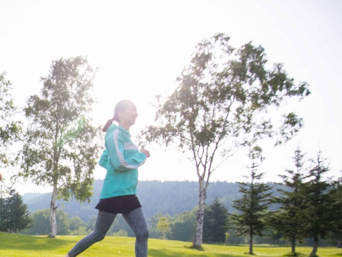 パワーウォーキングとは、深い呼吸を意識しながら、普段よりも早足かつ大股で体全体を使って歩くエクササイズです。肩と腕はリラックスし、脚全体を使い大きく前へ踏み込み、足はかかとから着地。有酸素運動であることに加え、呼吸は鼻から吸って口から吐く腹式呼吸を意識し、肺機能を鍛える効果をより高めます。また、ストレス軽減効果により免疫力も向上。喧騒とはかけ離れた大自然の中で、思い切り体を動かせます。