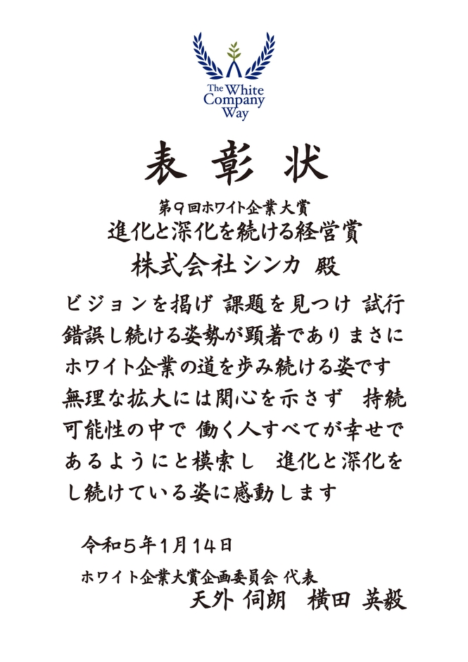 組織・人事コンサルティングの株式会社シンカ、 第9回 ホワイト企業大賞 「特別賞」を受賞!