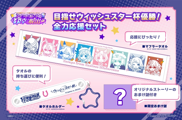 チケットは、2024年12月25日(水)22:00から12月27日(金)23:59まで、ぱかライブTV放送記念特別先行を実施。 2024年12月28日(土)から少年探偵SCRAP団(FC)団員先行、2025年1月4日(土)から一般販売がスタートいたします。そして今回は、限定グッズ「目指せウィッシュスター杯優勝! 全力応援セット」が付属する特典付きチケットも販売いたします。付属するグッズは、ウマ娘たちが描かれたマフラータオルや、タオルホルダー、オリジナルストーリーのおまけ謎。イベント参加時に身に着けて、ウマ娘たちを応援すれば盛り上がること間違いなしです。前売り限定の本チケットにもご注目ください。