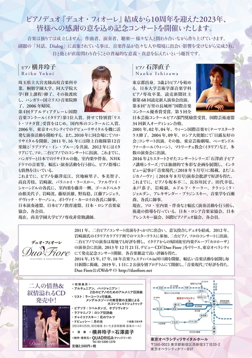 ピアノデュオ「デュオ・フィオーレ」結成から10周年を迎えた2023年、皆様への感謝の意を込めて記念コンサートを開催いたします。