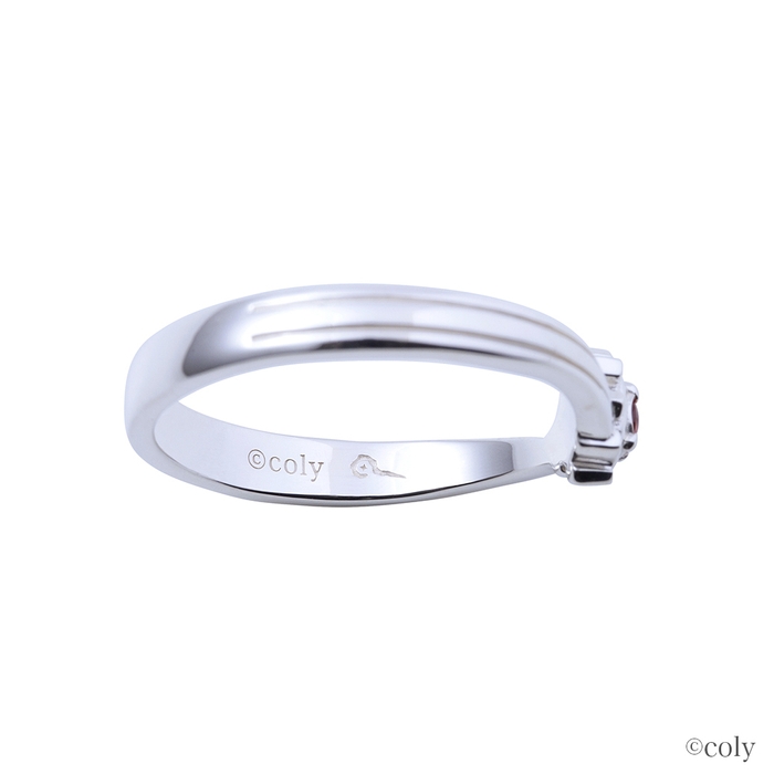 ブローチをモチーフとしてリングに取り込んだV字タイプのデザインに、イメージカラーストーンをセット。内側には魔道具のアイコンを刻印しました。スカーフをイメージしたラインがスタイリッシュなデザインです。