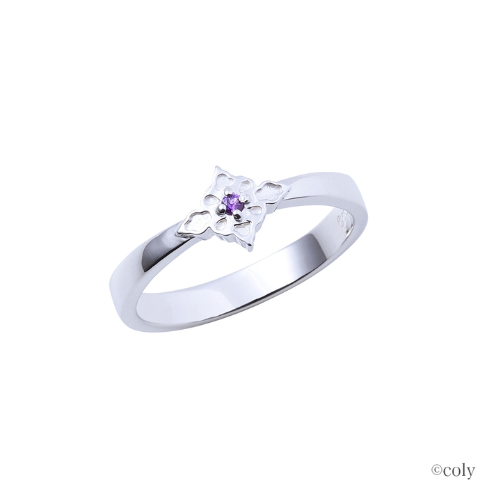 スカーフ留めをモチーフとしてリングに取り込んだストレートタイプのデザインに、イメージカラーストーンをセット。内側には魔道具のアイコンを刻印しました。繊細に表現したブローチが魅力的なデザインです。