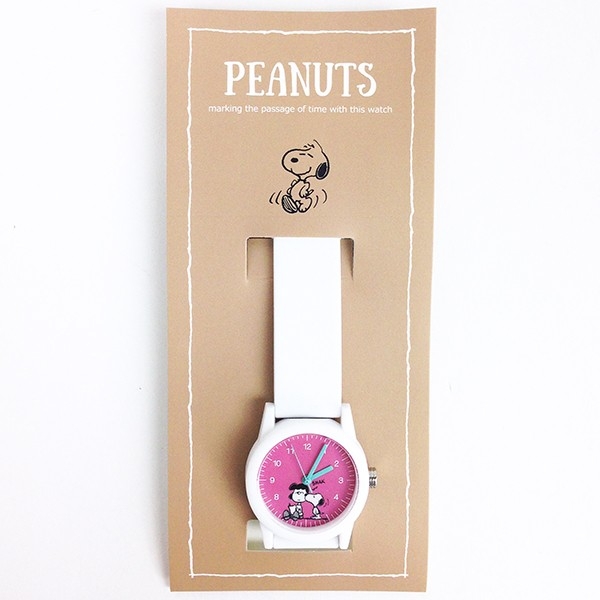 続いて、キュートなタイプのご紹介です。ピンクのベルトが華奢な手元を演出してくれますよ。スヌーピーとベルが描かれた文字盤もかわいいんです。