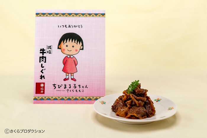 「ヒロシ&まる子 減塩 牛肉しぐれ詰合せ」のパッケージには、まる子とヒロシのイラストを使用しています。パッケージのひとつは、少し照れ顔を浮かべるまる子に〝いつもありがとう〟のメッセージを添えたデザイン。もうひとつには、ヒロシがまる子をおんぶするイラストで、お父さんと幼少時の娘の懐かしい思い出が回想されるようなデザインになっています。「減塩 牛肉しぐれ」の単品商品は、愛くるしいまる子が描かれた華やかなピンクカラーのパッケージデザインです。どちらも数量限定での販売となるため、父の日をはじめ、お誕生日や手土産など大切な方への特別なプレゼントにもおすすめです。