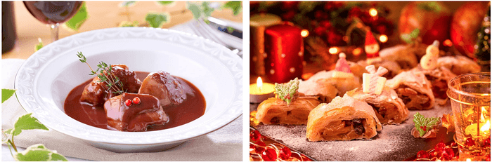 右:林檎とレーズンのキャラメリゼをパートフィロに包みサクサクに焼き上げた冬ならではのデザート。そのままはもちろん、バニラアイスを添えて召し上がるのもお薦めです。バイキングならではのご自分だけの一皿を作ってみませんか?