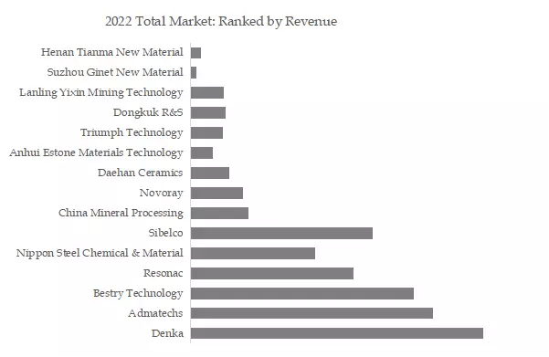 2022年には、世界の球状アルミナフィラー上位5社が収益ベースで市場シェアの58%を占める。上図は、球状アルミナフィラーにおける主要プレイヤーの売上高ランキングである。