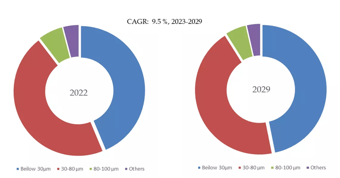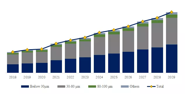 製品タイプ別では、30〜80μmが最大のセグメントで、46%のシェアを占めている。