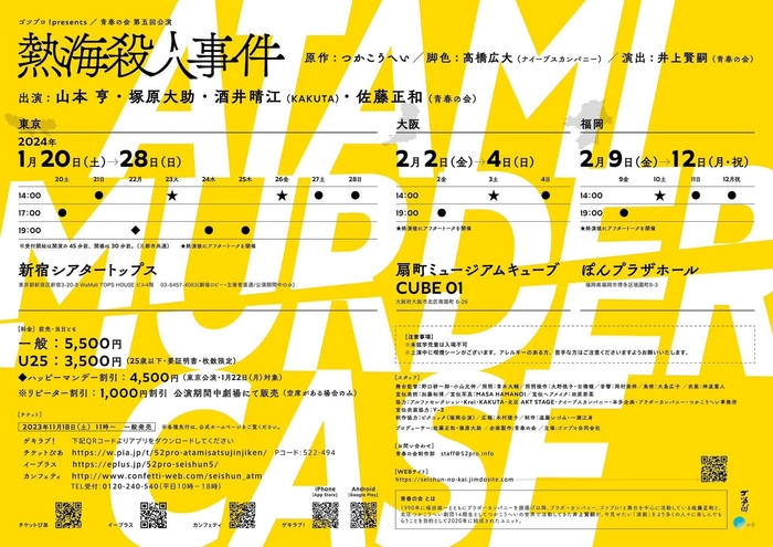 2024年1月20日(土)〜1月28日(日)新宿シアタートップスにて上演する、ゴツプロ!presents / 青春の会 第五回公演『熱海殺人事件』の一般発売が間近となりました。本公演は東京公演を皮切りに、2月2日(金)〜2月4日(日)の大阪公演、2月9日(金)〜2月12日(月・祝)の福岡公演と、3都市にて上演を予定しております。