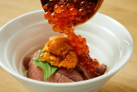 “うにといくらの丼かな?”と思っていると、うにといくらのほかにA5ランク和牛もご飯の上にのっているので驚きますよ。