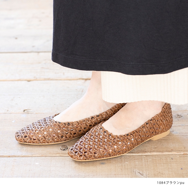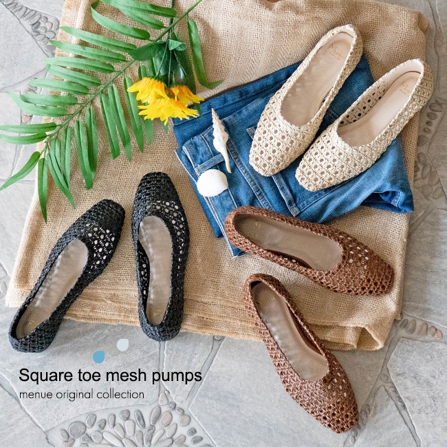 【商品情報】 注目のメッシュ編みシューズ。スクエアトゥメッシュ編みフラットパンプス