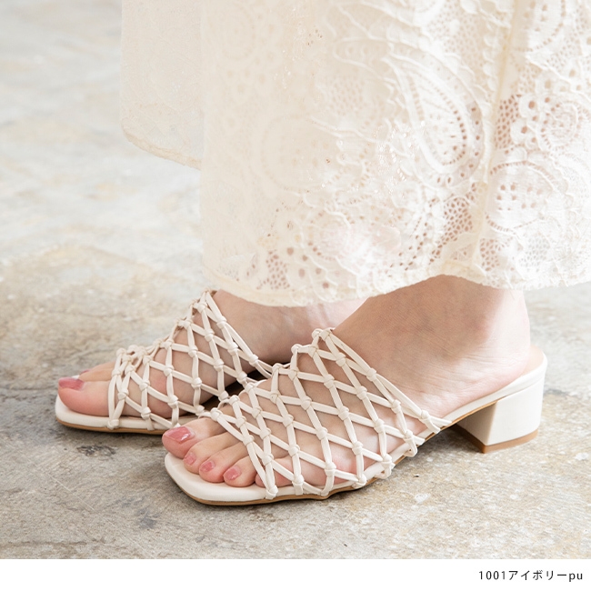 結び目がスタイリッシュなアクセント。スクエアトゥ編メッシュサンダル