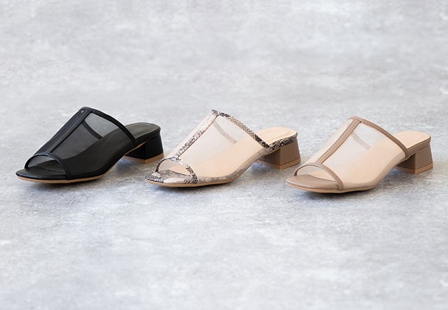 スクエアトゥ×5cm台形ヒール×透け感があるアッパー素材でトレンド要素が揃った一足。