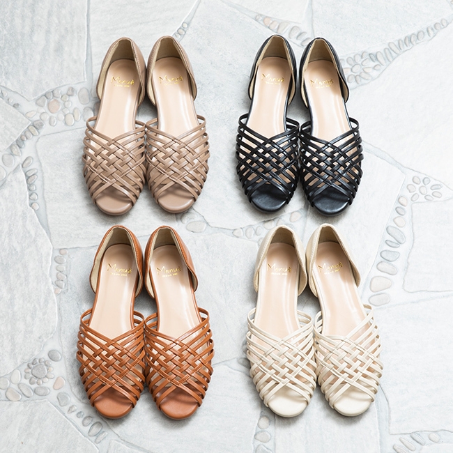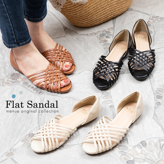 平ストラップが編まれたデザインが涼しげなルックスのフラットサンダル。