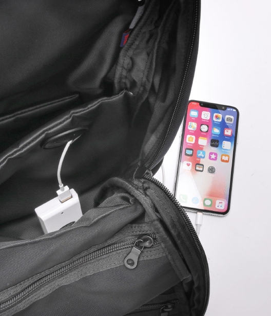 7.9インチまでのタブレットやスマートフォンを背負ったままアクセスできる止水ファスナー付ポケットを本体両サイドに装備。ケーブルを通じて本体に収納したバッテリーと接続可能。