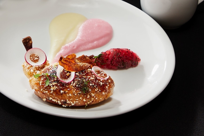 バレンタインシーズン限定で供されるのは、日本デベロップメントシェフ:セドリック・マトンが考案した「フォション バレンタイン メニュー」。前菜、メイン、デザートの3皿によるコースは、一皿ごとに甘味と酸味のバランスにこだわり、ピンクを印象的に用いたカラフルなプレゼンテーションで、スゥイート&サワ―な「愛」そのものを表現。フォションのピーチ&ザクロティーで甘酸っぱく風味づけした洋ナシに、ピンクに色づけたジンジャークリームとラズベリーマシュマロをふわりとかぶせた愛らしいデザートで締めくくるコースは、大切な人と分かち合う特別なひと時に最適なバレンタインメニューです。