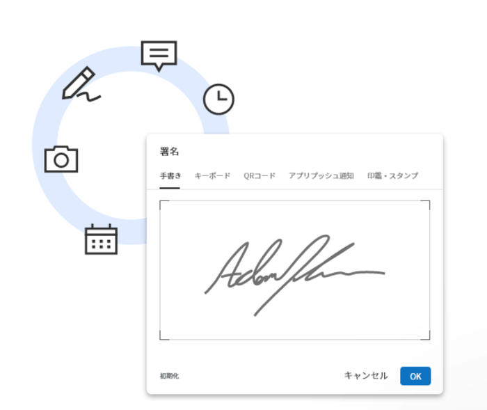 eformsignは、PC・スマホ・タブレットすべてのデバイスで対応しているため、いつでも署名(サイン)などができます。3秒あれば、筆圧と画数まで署名に関連するすべての情報を保存できるため、遠隔でもカンタンに作業が可能です。