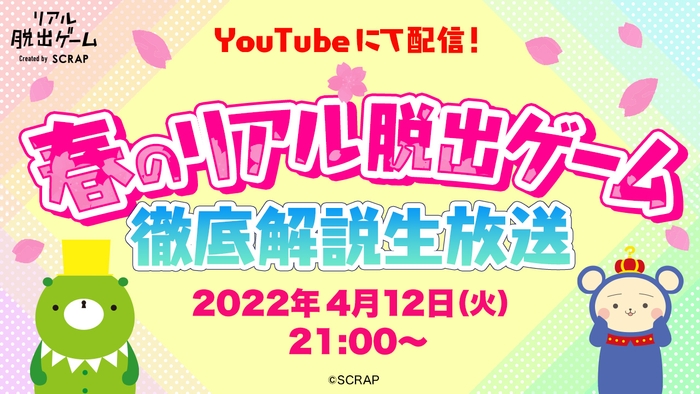 株式会社SCRAP(本社:東京都渋谷区 代表:加藤隆生)は、2022年4月12日(火)21時よりYouTube Liveにて緊急特番『春のリアル脱出ゲーム 徹底解説生放送』を配信することを決定いたしました。