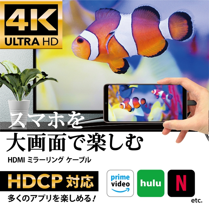 また、著作権保護機能(HDCP)対応により多くのアプリをお楽しみ頂けます。デバイスとテレビを繋ぐだけの簡単接続設計で、ミラーリング中も充電が可能です。