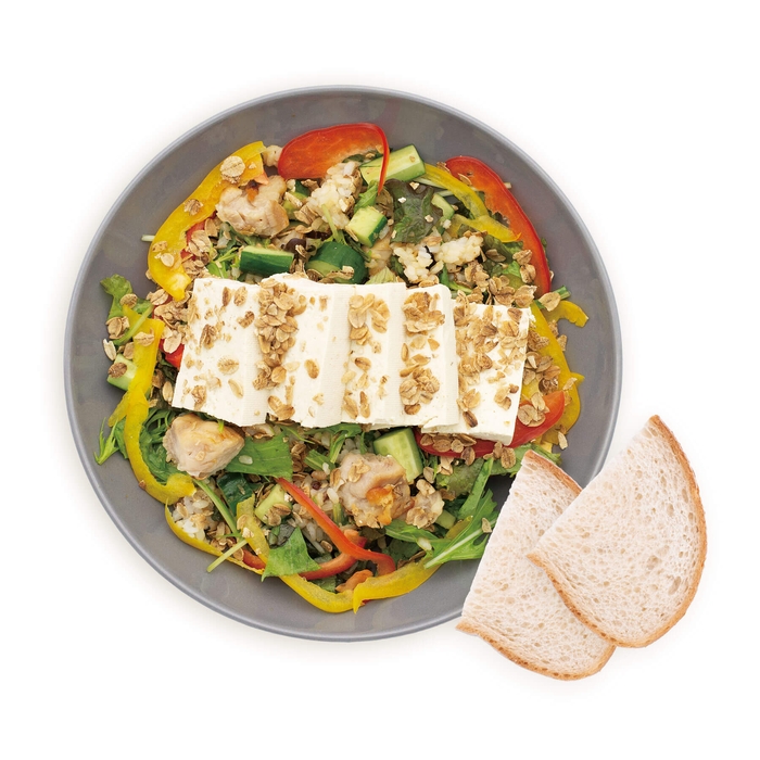 たっぷりの野菜に自家製塩豆腐やローストチキンを添えて食物繊維たっぷりのスーパー大麦バーリーマックスをトッピング。ライスと合わせることで、ひと皿で満足できるボリュームのあるヘルシーサラダプレート。