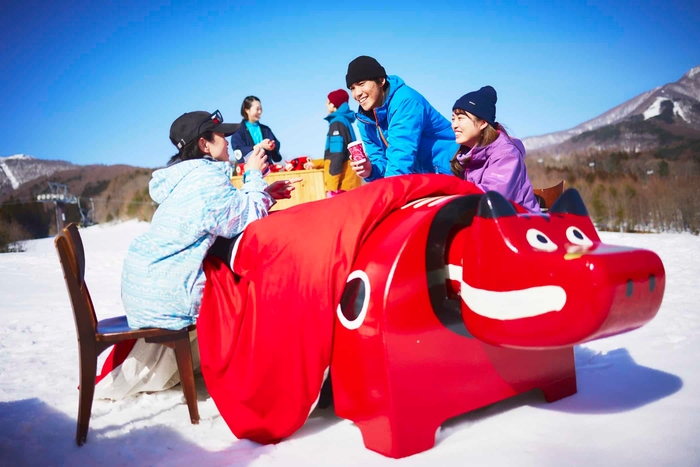 当広場は、遊具や、衣装に至るまで、どこもかしこも赤べこだらけな、べこジェニックな空間です。2022‐23シーズンは、新たに赤べこの形をしたこたつ「べこたつ」を新たに設置します。その他にも、家族みんなで写真が撮れるフォトスポットが設置され、昨シーズンよりもさらにべこジェニックな広場となります。