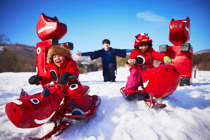【磐梯山温泉ホテル】赤べこをモチーフにした「赤べこそり]などの遊具で、ここでしか体験できない雪遊びを楽しめる「でっこら赤べこ雪広場」がオープン ~2022-23シーズンは赤べこ雪上車が新登場~|期間:2022年12月23日~2023年3月26日