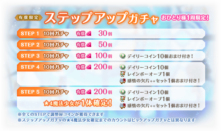 ※STEP5での★4魔法少女について、ピックアップ対象の魔法少女が確定するわけではございません。