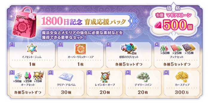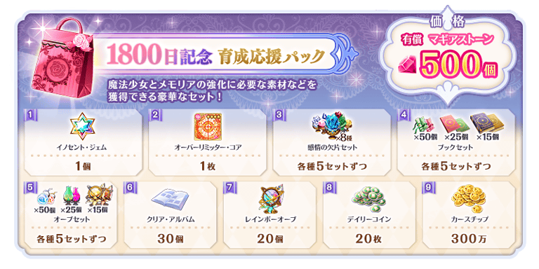 本ショップでは、対象の★4魔法少女のうち未所持の魔法少女1体を獲得することができます。